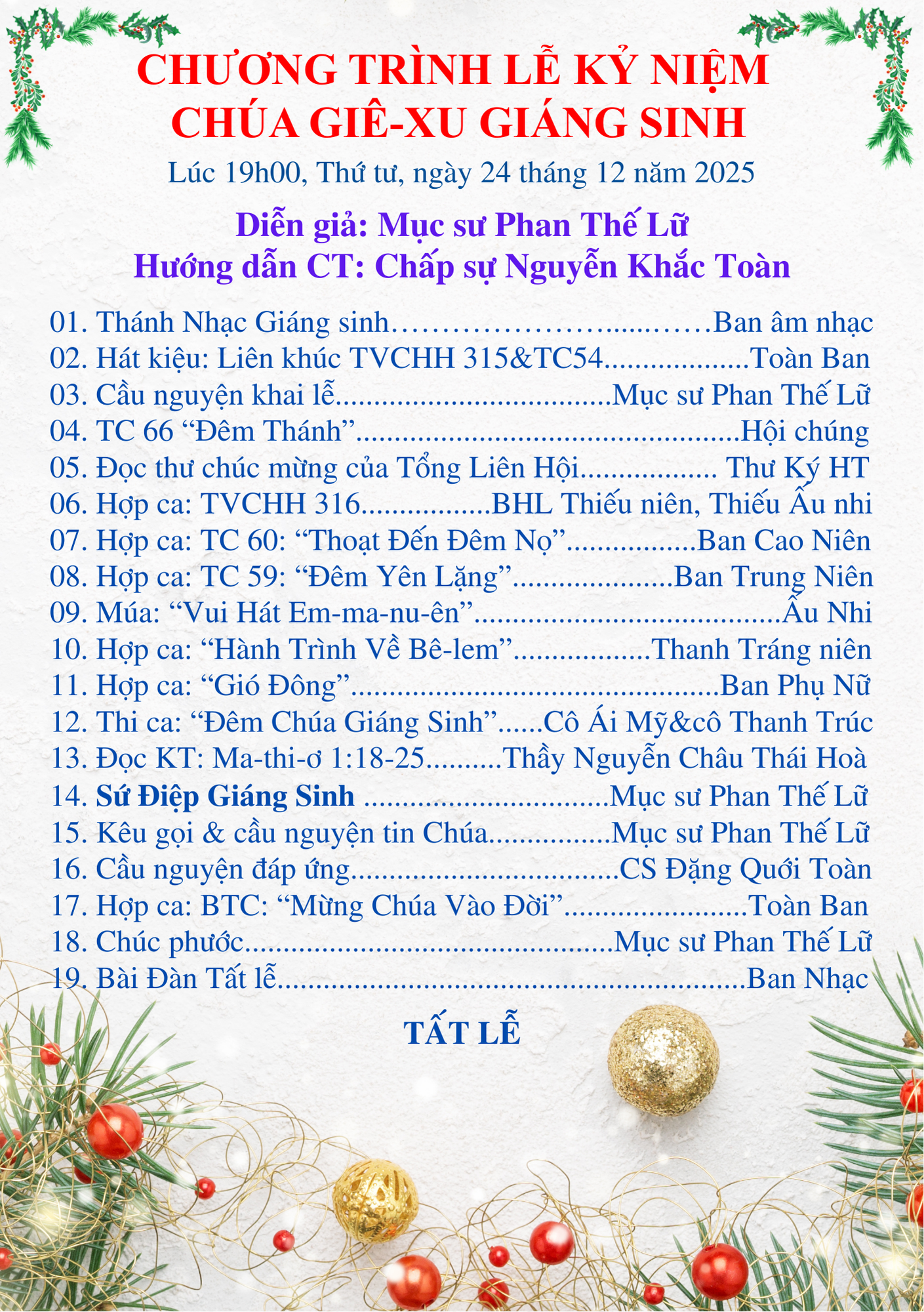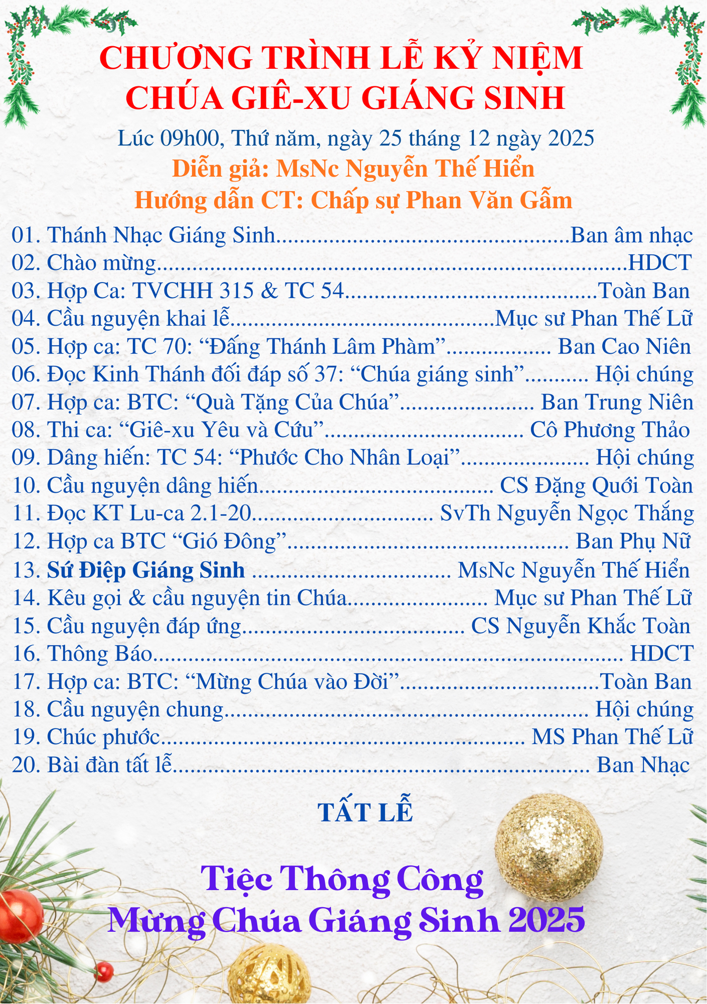 CHƯƠNG TRÌNH LỄ KỶ NIỆM MỪNG CHÚA GIÊ-XU GIÁNG SINH NĂM 2025