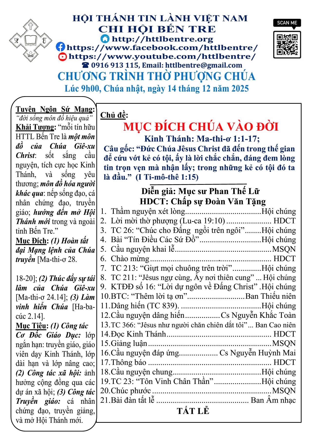 CHƯƠNG TRÌNH THỜ PHƯỢNG CHÚA (14-12-25)