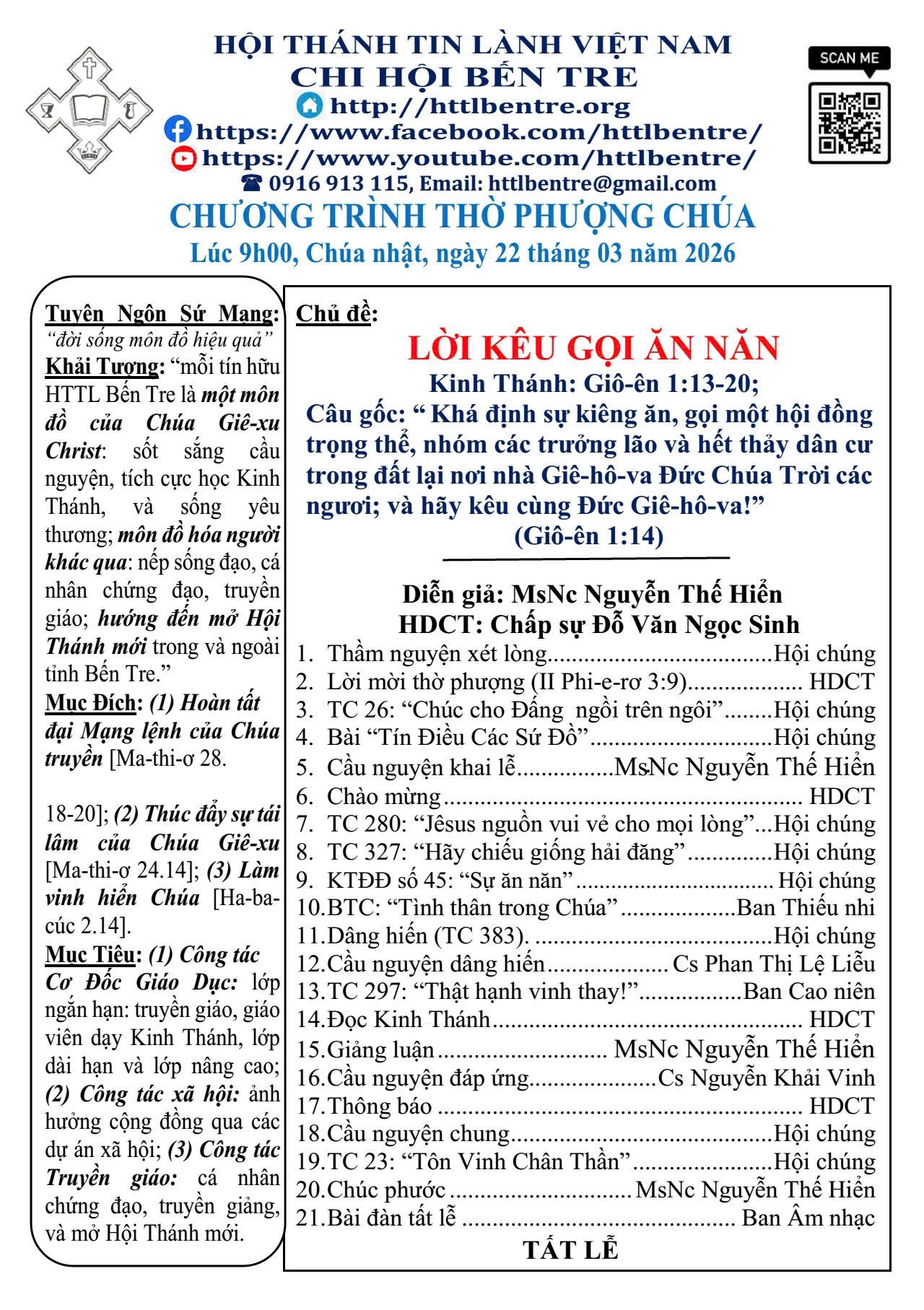 CHƯƠNG TRÌNH THỜ PHƯỢNG CHÚA (22/3/26)