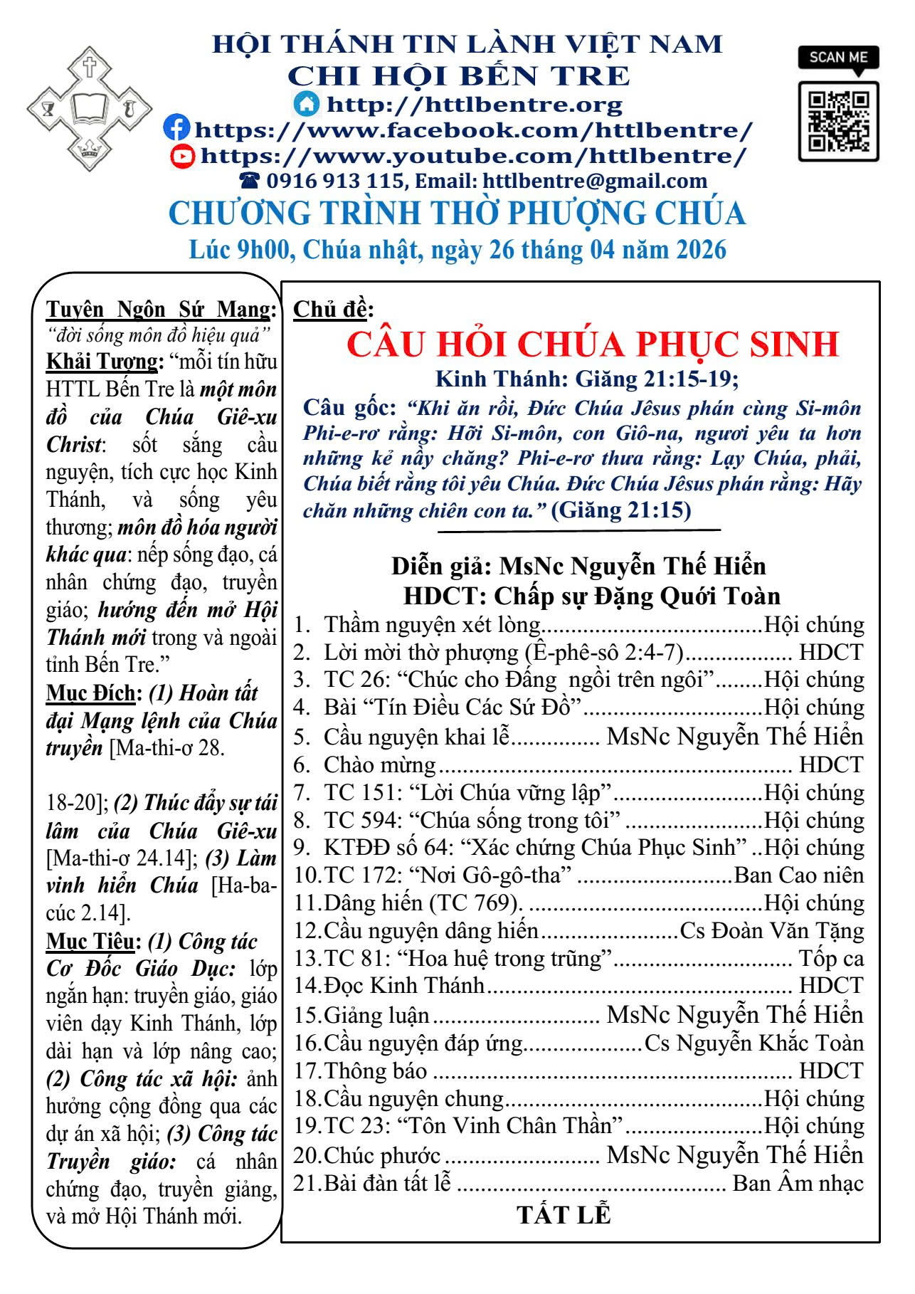 CHƯƠNG TRÌNH THỜ PHƯỢNG CHÚA (26/4/26)