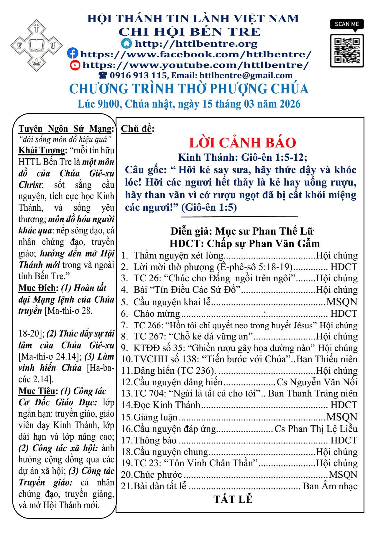 CHƯƠNG TRÌNH THỜ PHƯỢNG CHÚA(15/3/26)