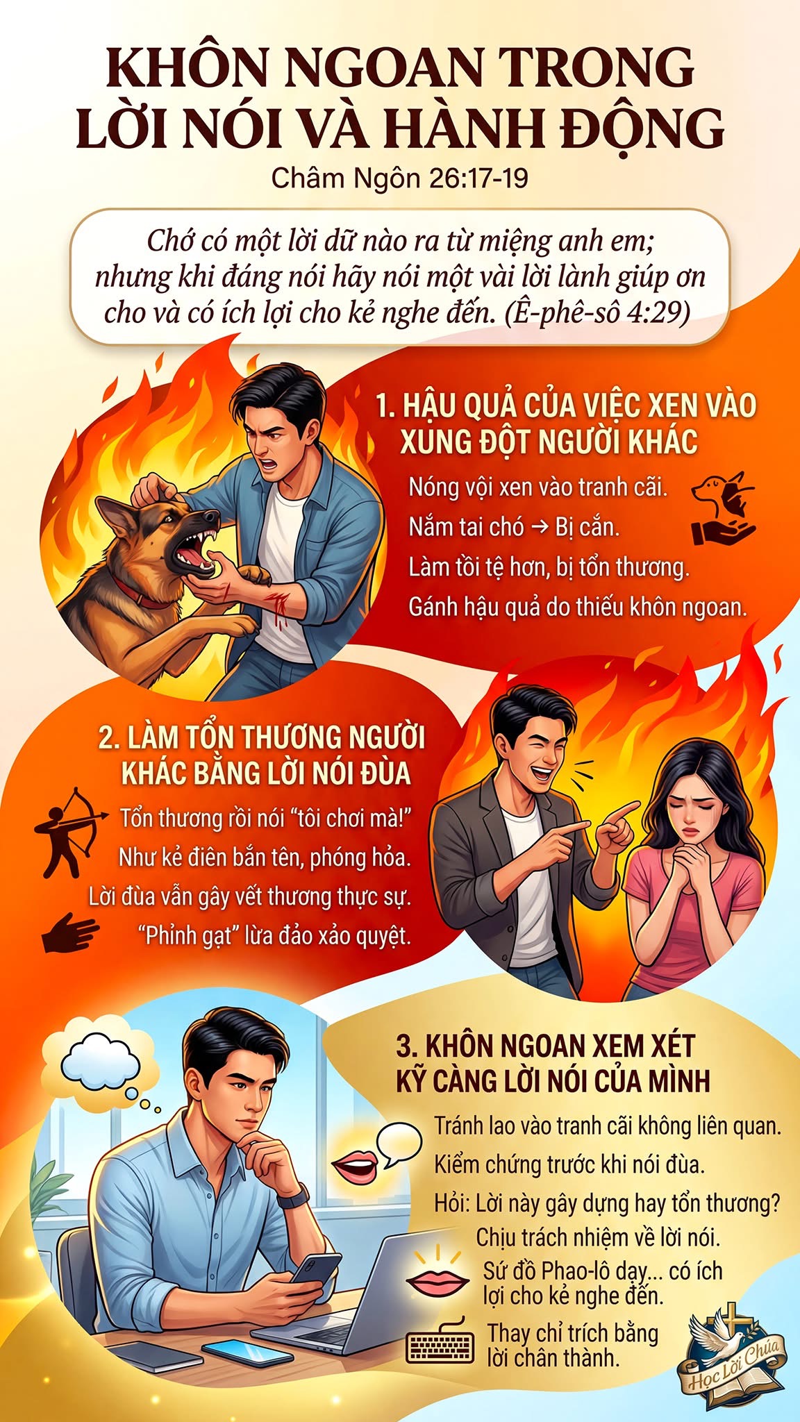 Ngày nay, truyền thông phát triển, quá nhiều người sẵn sàng lao vào bàn phím để tranh cãi những việc không dính líu tới mình, sẵn sàng kết án người khác dù chẳng rõ họ là ai. Một số người đem những nan đề của người khác làm trò đùa với những câu nói vô trách nhiệm, thiếu kiểm chứng để lại hậu quả cho người, cho mình. Một số người thường hay xen vào chuyện xung đột của người khác, hoặc vẫn nhanh nhạy đưa ra lời khuyên dù không được mời. Lời Chúa nhắc chúng ta phải khôn ngoan xem xét kỹ càng đây có phải việc của mình không? Sự tham gia của mình sẽ giúp ích hay gây hại? Ngoài ra, trước khi nói đùa hãy tự hỏi: “Lời này sẽ gây dựng họ hay làm tổn thương người nghe? Tôi có sẵn sàng chịu trách nhiệm hoàn toàn về lời nói của mình không?” Sứ đồ Phao-lô dạy: “Chớ có một lời dữ nào ra từ miệng anh em; nhưng khi đáng nói hãy nói một vài lời lành giúp ơn cho và có ích lợi cho kẻ nghe đến” (Ê-phê-sô 4:29). Xin Chúa giúp chúng ta thay thế những lời chỉ trích hoặc châm biếm bằng lời chân thành đem lại ích lợi cho người nghe.